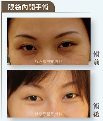 徐永康醫師開業17年的豐富經驗,他對付眼袋採用三合一的手術方式:首先對付多餘脂肪,移除眼袋脂肪堆積,並且縫合固定眼下筋膜,如果有明顯淚溝,需將脂肪推移填平淚溝。第二:凸出的脂肪壓迫,造成眼睛充血,紅血球跑到血管外圍肌肉,形成黯沈的熊貓眼,因此在移除脂肪之後,需利用雷射處理增生血管和沉積的黑色素,可改善黑眼圈。最後,外開式手術會切除多餘的鬆弛皮膚,達到拉提、減少細紋,讓美化眼部呈現完整最佳效果。