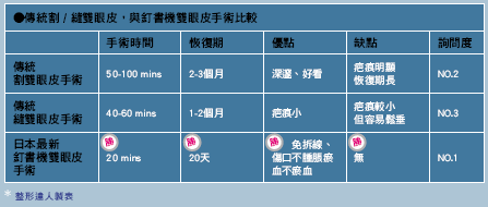據車參聖醫師表示,源自於日本的釘書機雙眼皮手術,堪稱美容整型界的當紅炸子雞,只要數分鐘,經過整型醫師巧手來回在眼皮上釘幾針,馬上就能擁有一雙電力十足的大眼。傷口就僅僅像釘書針的釘孔一般,幾乎不腫脹不淤青,術後免貼膠免拆線,隔天就可以上班上課,沒有所謂的醜小鴨期,這樣方便的美容整形手術獲得最大的好評。