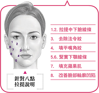 像這個時候, 我們可以採用「八點拉提」的方式,透過優秀的醫師技術,利用玻尿酸吸水力填充澎潤的特性,在臉部八個關鍵部位的附近,單點施打小劑量的玻尿酸,透過玻尿酸鎖水、保濕的效果,來達到使皮膚有效支撐、緊緻的效果,恢復我們臉部的豐潤,同時減緩臉部肌膚的下垂,並由內而外的改善整體膚質,讓戀愛桃花美顏再現。