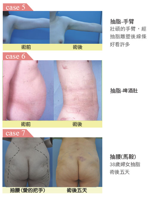 四、抽脂不但是一門醫學技術,它更是一門藝術,若能利用抽出的脂肪同時移植到所需填充的部位,如豐臀、豐胸、手背圓潤等以達成「體雕」黃金比例;也可同時填補夫妻宮、印堂、淚溝、蘋果肌、豐頰、木偶紋、下巴曲線及頸紋等等,達成「臉雕」童顏曲線美。
