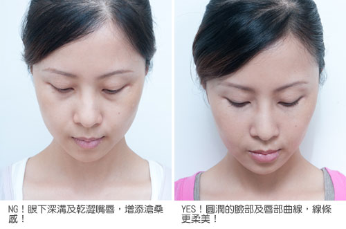 仔細看她的皮膚細緻,的確是比同年齡的女性好很多,但可惜的是,眼周有著揮不出的疲累,嘴唇看起來也較乾癟,是臉上兩個比較明顯老化的區域。